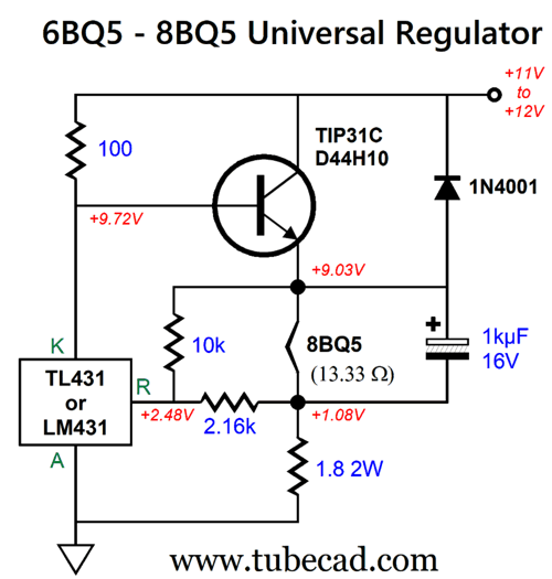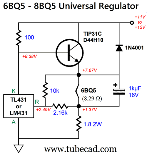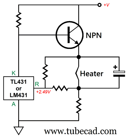The NPN transistor needs to be a power type and needs a heatsink; each tube requires one of these circuits. Note the 11Vdc to 12Vdc input power-supply voltage in the following schematic, which is about half of what the alternative UHR with an LD1084 voltage regulator needs. In other words, half the dissipation.