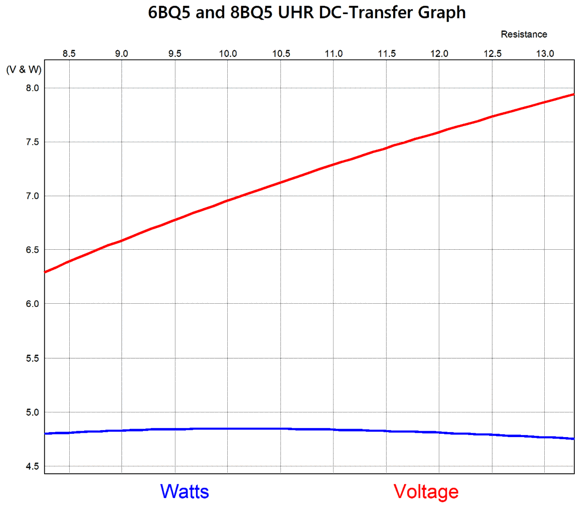 We don't quite hit the 8Vdc target for the 8BQ5, but 7.9Vdc is certainly close enough. By the way, a 6BQ5/8BQ5 tube is most likely to be used in a tube-based power amplifier, but the noval pentode has other uses. For example, when triode-connected, the 6BQ5/8BQ5 makes a fine triode with a mu of 17.7 and an rp of 1600 ohms and transconductance of 11mA/V. A similar pentode, the 6CW5/EL86, a lower-voltage cousin to the EL84, also makes a stunning triode when triode-connected.