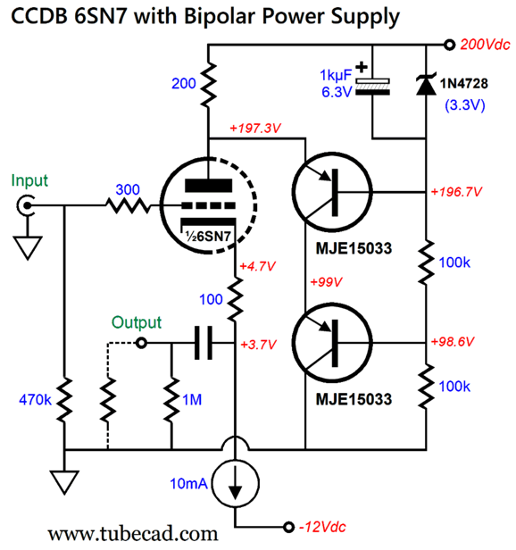The top MJE15033 PNP transistor strives to see a fixed voltage between its base and emitter, which is only possible if the 200-ohm plate resistor experiences a fixed voltage drop, which implies a constant-current draw. If the cathode follower draws more than its idle current, the two PNP transistors will draw less current in equal measure. Note that the top MJE15033 does not perform any voltage regulation. In fact, it ensures that whatever power-supply noise appears at the top of the 200-ohm resistor will appear at the bottom of the resistor. As far as the power supply is concerned, the 200-ohm resistor terminates into a constant-current source. Indeed, if the tube is missing from its socket, the circuit will still draw the same constant current. (In case you were wondering if the zener should be bypassed by a large-valued electrolytic capacitor, the answer is yes.) What about using this circuit with a bipolar power supply? It's possible.