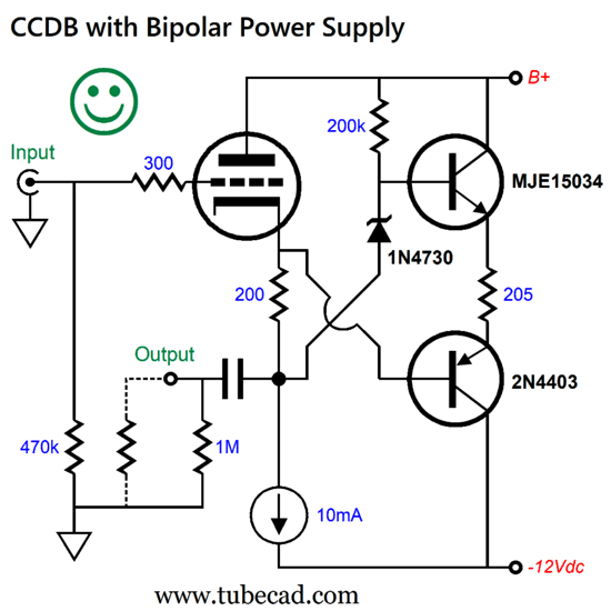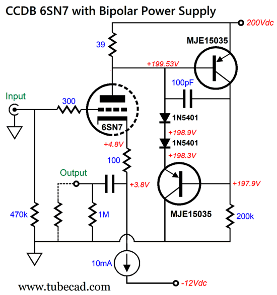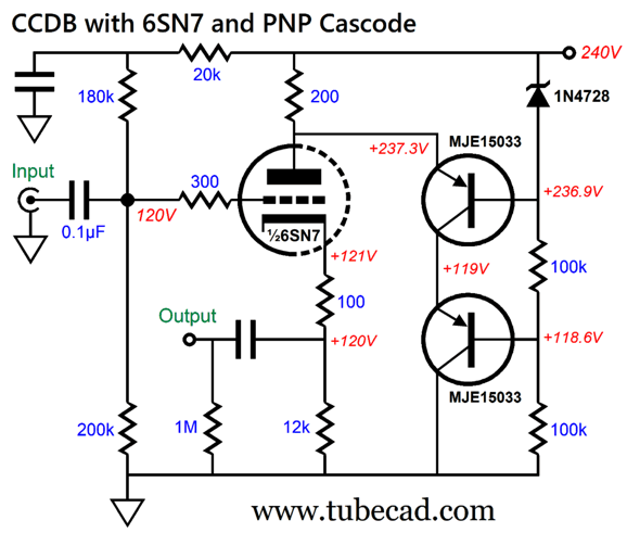 The left triode draws 10mA, while the right triode draws about 3.5mA. The 1N5401 rectifier acts as a simple voltage displacer. In fact, we can replace both the 1N5401 and the 2N4403 with a single PNP Darlington transistor, such as the ZTX705 or TIP115. Is this what I deem the best choice? No. Often, I do not save the best for the last. If I were to build a CCDB today, I would use the topology with a single PNP transistor and emitter resistor equal to the cathode resistor.