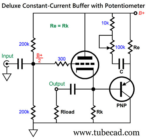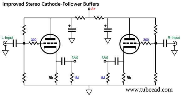 The output coupling capacitor and capacitor C must match in value, but not necessarily in quality. This improved version assumes that we know what the external load impedance will be. In other words, it lacks universality. Your tube-based power might sport a 100k input impedance, but your friend's solid-state power amplifier presents a heavy 10k load. The workaround would be to use a resistor and potentiometer pairing in place of the single resistor.