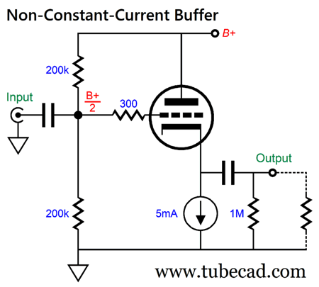 This works fairly well, as long as the external load driven is high impedance and the cathode resistor is low in value relative to that load; for example, a load of 100k and a cathode resistor of 10k. If nothing else, much like an elevator car and its balancing counter weight, we have cancelled the current variation caused by the cathode resistor, leaving only the current variation due to the external load being driven. Here is 6SN7-based design example: