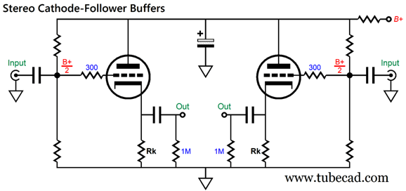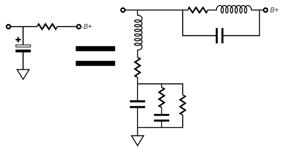 As the input stage, the grounded-cathode amplifier, draws more current, the output stage, the cathode follower, draws less, with the variations in current conduction cancelling. This arrangement prevents the power supply from experiencing any signal-induced current flow agitations, distresses, or perturbations. Why is that important? If the B+ voltage is delivered by a high-quality, high-voltage regulator, perhaps it isn't all that important. But what we usually encounter in tube-based circuits is RC-filtered power supplies, where a series resistor is terminated by a large-valued capacitor to ground. The problem here is that neither the resistor nor the capacitor is perfect.