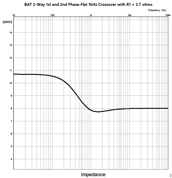 Why? Perhaps you have noticed that many of the most highly esteemed (and expensive) loudspeakers now sport rear-firing tweeters. The reason behind this added expense and hassle is that the sound improves. Back in the previous century, listening tests were conducted to discern which loudspeakers sounded best. One finding was that the more closely the reflected sound's bandwidth matched the direct sound's bandwidth, the higher the loudspeaker approval rating. (Of course, a rear-firing tweeter on a bookshelf loudspeaker or a corner horn loudspeaker will not do any good.) This finding helps explain why electrostatic and dipole planar loudspeaker are so valued. Next, my attention was drawn to the BAT phase-flat crossover's use of a 2.7-ohm resistor in the following schematic.