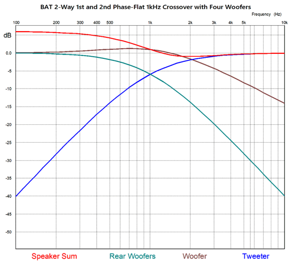 This SPICE-generated graph shows the electrical signals delivered, but not the actual acoustical output, as the three added woofers will offer a 9.5dB boost in SPL due to the threefold increase in radiating surface area. Speaking of reality, the tweeter must offer 2.5dB less SPL than the front woofer. The modified following graph is closer to reality.