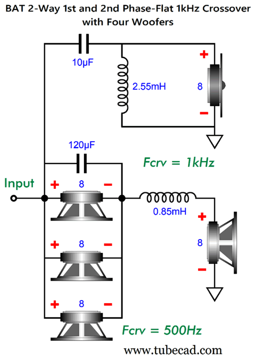 The tweeter's SPL has been reduced by 2.5dB due to the 2- and 24-ohm resistors, thereby undoing the-2.5dB insertion loss that the woofer undergoes. And the same topology, but with the following enhancement: