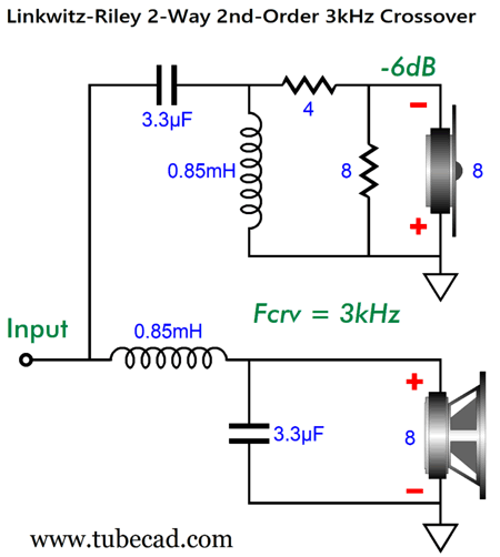 (Note the phase reversal on the tweeter; the Linkwitz-Riley crossover is not phase-flat.) The 8-ohm resistor shunting the 8-ohm tweeter creates a 4-ohm resistance. Well, what if we used a 4-ohm tweeter instead and lose the 8-ohm resistor?