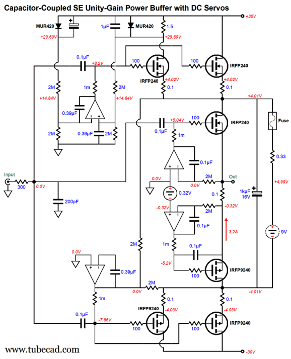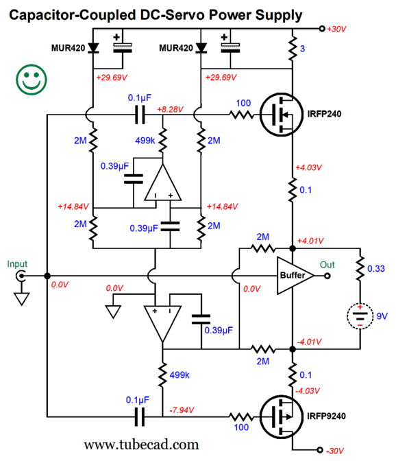 The cascode MOSFETs have been doubled up to reduce individual dissipation and excessive voltage drop across the 0.1-ohm source resistors. The floating 9V power supply gets an RC capacitor in the added 1kµF electrolytic capacitor, which will banish the high-frequency ripple from the switch-mode power supply. Note the change in the servo resistor values, 1M versus 499k. Why? If the center power buffer is DC coupled at the input, we use 499k resistors, but with a coupling capacitor, we use 1M resistors, which creates a high-pass filter Q of 0.5.