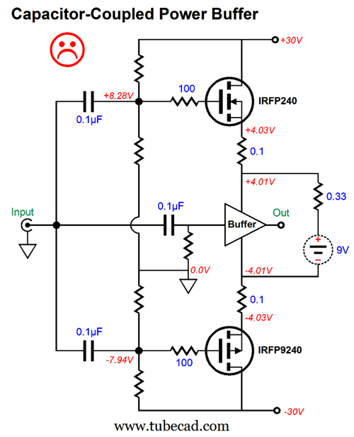 Note that the output stage drives the cascode MOSFETs via the two zener diodes. The extra load presented, 1k, by this bias arrangement is trivial compared to the 8-ohm loudspeaker, but what does worry me is that the single-ended buffer's departure from the input signal will also be imposed upon the cascode MOSFETs' output. This got me thinking about adding two extra input coupling capacitors and letting the input signal drive the cascode MOSFET directly.