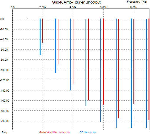 Now, still using the flawed SPICE model, the distortion climbs closer to the grounded-cathode amplifier’s, but still much better, as is shown in the graph below.