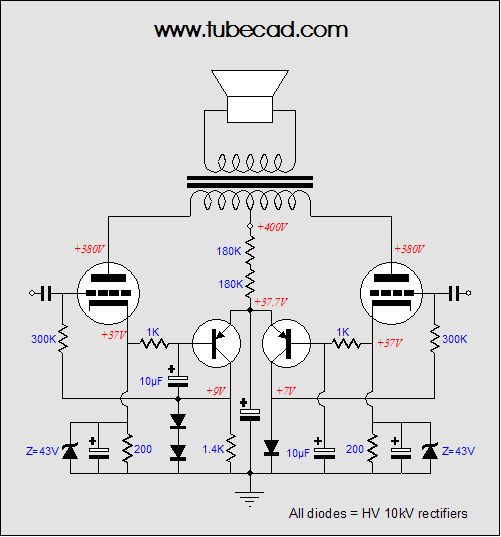 Or, we can replace the OpAmp with a simple transistor-based differential amplifier, with a long tail that extends up to the output stage’s B+ voltage. (The 360k resistor is as good as a constant-current source in this circuit because of its large value.) Diode, D1, is a high-voltage rectifier that exhibits a forward voltage drop of 7 volts (internally, seven diodes are wired in series). This diode is used here as a low-current voltage reference, which is important because we do not want the differential amplifier to draw more than 1mA total. (Zener diodes require far too much current conduction to break at such a low voltage.) This diode's forward voltage drop sets the range of possible negative voltage adjustment, as the diff-amplifier’s output cannot swing below ground in this circuit. (If a negative power supply is available, then much smaller cathode resistors can be used and the diff-amplifier’s out could swing down to the negative power supply voltage.) A more-fleshed out version is shown below. The zeners are used to limit the rectification effect of the output tubes undergo in heavy use. The added capacitors filter away the AC signal that might be present on the cathodes. All in all, not a bad circuit—particularly, when no negative power supply is available.