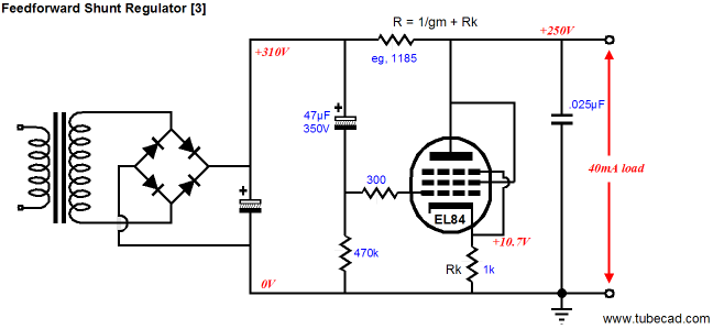 Shunt Regulators Google lists 26 finds for the subject "Shunt Regulators" at the Tube CAD Journal Website. I expected more. A week ago I felt that I had said all that I could say on this topic; today, I see that only a small portion of possible circuit twists has been covered. (Besides, some differently-phrased repetition can only help the many who do not really understand this topology.) First, a quick recap and then we can move on to some interesting new shunt regulator designs.