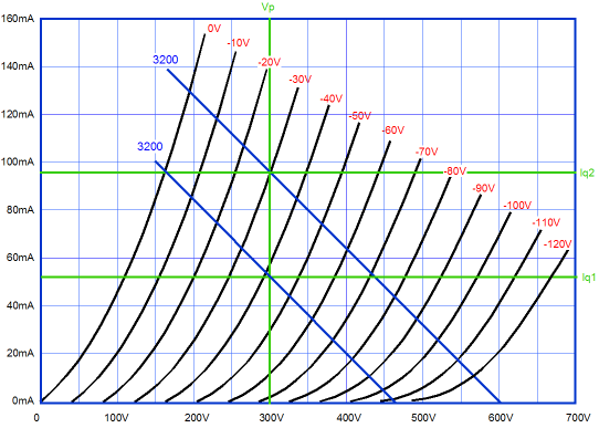 The composite plate curves are made by subtracting one output tube's current conduction form the other. At idle, when both tubes conduct equally, the two currents equal and thus cancel, which places the center of the composite curves at zero grid volts and zero current into the load. As the output stage is driven by inverted drive signals, the non-linear transfer curves are averaged. So one tube's greater conduction is met with the other tube's lesser conduction, hence the straight lines formed in the composite plate curves drawn from two output tubes operating in pure Class-A and the wobbly curves formed by the same tubes in Class-AB.