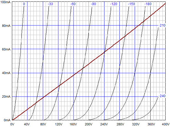 Okay, since I made the CCDA PCBs quite some time ago, why haven’t I started selling them? The big problem that I faced, other than lack of time, was how to make universal kits. Unlike the Aikido, which delivers a perfect platform for tube rolling, as vastly different tubes can be swapped in and out of the board (6AQ8 or 6H30) without having to change the resistor values, the CCDA requires more care in selecting resistor values. For example, a CCDA line-stage amplifier that ran 6CG7s and used 20k plate resistors and 430-ohm cathode resistors could never accept a 6DJ8, 6H30Pi, or 6N1P, as the plate voltage would not center at B+/2, which the CCDA requires. But then, many are not pathological tube rollers; in fact, many do not own thousands of tubes, just a single pair. The still-worrisome problem was, however, assuming the user stuck to one tube type, the daunting array of different possible B+ voltages. For example, that 6CG7-based line-stage amplifier might run a B+ voltage of only 140Vdc or as much as 300Vdc. Assuming an idle current of 7.5mA per triode, a huge array of plate and cathode resistors would be needed. Moreover, the plate resistor cannot be the little 1/2W devices that the Aikido freely uses, but big 2W or 3W power resistors, which are hard to find and expensive. Then it hit me, let the idle current move, but lock the plate and cathode resistor values. A triode with a cathode and plate resistors acts like a resistor, not a perfect resistor, but a fairly good one. Here is a thought experiment: imagine that at the tube factory a resistor was soldered in place within the tube at its cathode and that the only pins, other than the two heater pins, were connected to the other end of the internal resistor and the plate. Now imagine that this odd design were given to a research scientist who set about measuring it. He would find that its current draw varied with applied voltage, much like a resistor, but with some sag in its current versus voltage plot.
