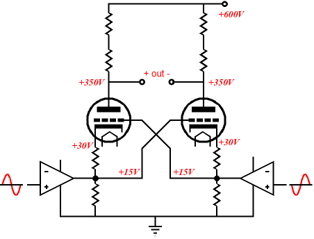 The P–channel FETs limit the current flow through the triodes and should be tightly matched. The circuit's gain is limited by the 200-ohm drain resistors, but the circuit's PSRR is extremely good, as the FET's high drain impedance shield the 200-ohm resistors from B+ noise quite well. Now, let's take this circuit and cascade it. The resulting circuit is an electrostatic headphone amplifier. (A DC-coupled version could be designed, but I would be too intimidated by the high voltages to try.)