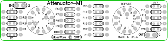What is a GlassWare M1 mono stepped attenuator? The M1 stepped attenuator combines both series and ladder stepped attenuators into a single functional attenuator. The ladder attenuator's job is to provide six fine steps of attenuation, each step being -1dB; the series attenuator, eleven coarse steps of attenuation, each step being -6dB. The result is that 66 attenuation settings are possible. In other words, we can set the attenuation to any value from 0dB to -65dB in -1dB decrements. The genius of the design is that it only requires two inexpensive rotary switches, instead of one 66-position, insanely expensive rotary switch, assuming that a 66-position rotary switch is even made. In Addition, the GlassWare M1 mono stepped attenuator only uses 21 resistors, not the 66 resistors that a series attenuator would require or the 130 resistors demanded by the ladder attenuator.