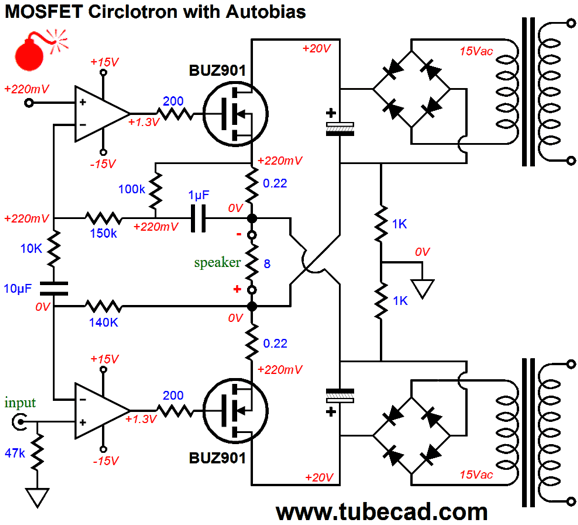 Thus, if you decide to forgo the idea of building a 200lbs power Circlotron amplifier that sports twenty 6AS7 triodes per channel and instead opt for just a pair of N-channel MOSFETs, then the issue of setting the idle current might prove more difficult than you expected. (By the way, Microsemi.com offers a good tutorial on MOSFETs: 14692-mosfet-tutorial.) Note how increasing the MOSFET's gate voltage by just +1V results in such a large increase in current conduction. True, adding a source resistor will greatly slow down the power MOSFET’s gate sensitivity, as the MOSFET’s effective transconductance with an unbypassed source resistor is: gm' = gm / (1 + gmRs) For example, a MOSFET with a raw transconductance of 10A/V will see its transconductance fall to 3.125A/V, with the addition of a 0.22-ohm source resistor. But even compared to ten 6AS7 triodes in parallel, this is still a screaming amount of transconductance, as a 0.1V change in gate voltage will result in a 312.5mA change in idle current. I want you to keep all this in mind as you look at the following schematics.
