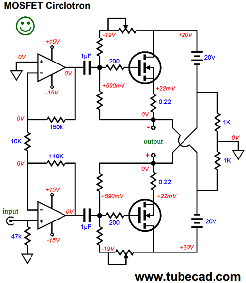 Although it looks reasonable enough, this circuit doesn't work once the amplifier leaves its class-A range of operation. Note how the top OpAmp’s non-inverting input no longer attaches to ground, but to a reference voltage, in this case 220mV, which will be imposed across the 0.22-ohm source resistors, resulting in a heavy idle current of 1A. The bottom OpAmp will strive to eliminate the DC offset by ensuring that both MOSFETs draw an equal idle current. Both OpAmps include the Circlotron’s output in their negative feedback loops, so the OpAmps control the MOSFETs' output. But once the class-A envelope of operation is exceeded, the 1µF begins to charge up due to rectification effects caused by the 0.22 source resistor voltage drop exceeding 0.44Vpk during high-output operation. The following workaround that I have come up with requires a balanced input signal. In addition, two extra 1M resistors have been added, which work to undo much of the rectification effects. So where is the smiley face? Although this circuit has passed the SPICE tests, it hasn't been built and tested in reality. It is quite possible that long, sustained organ notes or droning sympathizer bas will eventually overthrow the auto-bias aspect of the circuit, resulting under-biased MOSFETs, which although much more preferable to over-biased MOSFETs, is still a defect.