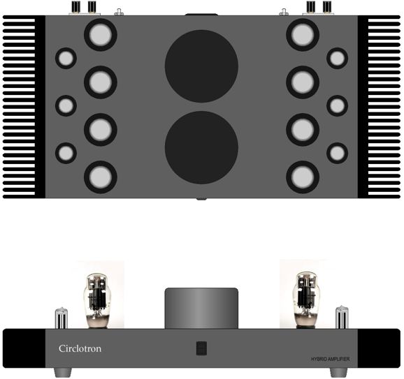 Okay, now imagine that the triode's cathode resistor is only 4 times larger in value than the NPN transistor's emitter resistor, which would imply that the triode would do 1/4th the work that the transistor does and that the 8-ohm load would appear as an 40-ohm load (five times bigger). Now, 40-ohms is still far too brutal a load for any triode, so imagine four times more triodes and transistors in parallel on each side of the load, so the effective load impedance that each triode sees is 160 ohms. Now we are talking, as a 6AS7 can drive a 160-ohm load. For example, a peak of 200mA equals a peak voltage of 32V with a 160-ohm load. (32Vpk into an 8-ohm load equals 64W of power.) I am going to leave all the technical details for next time, but here is what such an amplifier could look like (in a stereo version). The big round cans hold toroidal power transformers. The heatsinks cool the eight power transistors per channel. Such a Circlotron amplifier could easily put out 6oW, even with conservative operation of the 6AS7 triodes, say 200mA peak output current and no positive grid voltages.