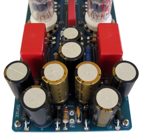 If an 18Vac input voltage is used, a raw DC voltage of about 148Vdc is created. The 92Vdc voltage is perfect for use with four 6DJ8 tubes; the 148Vdc, with four 12AU7 tubes. The 12Vac transformer used with 6DJ8 tubes must provide at least 1.5A of current, which equals a VA rating of 18; the 18Vac transformer used with 12AU7 tubes must provide at least 1A of current, which equals a VA rating of 18. Ideally, a transformer with a good regulation figure (say the 5% to 10% a good toroidal transformer would offer) would be used; this is unlikely to true of a wallwart transformer, however, so some adjustment of the RC filter resistor values (R11 & R12) might be needed. The heaters must not see an over voltage, as such a voltage will greatly shorten the tube’s life.