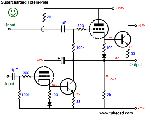 The two high-voltage NPN transistors have their based grounded and are configured as common-base amplifiers. As the two floating 50V power-supply rails swing up and down with the output voltage swings into the speaker, the two 4.7k emitter resistors see a varying current flow, which the two 4.7k collector resistors reflect. In addition, the two floating 50V power-supply rails also swing up and down with the output voltage swings. The result is a voltage gain of two. In other words, for every volt of swing at the output triode's cathode, its plate sees twice that swing. Supercharging, in a nutshell. Moving one step back from the naked supercharged Circlotron output stage, we see a simple driver stage added.