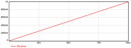 The two resistors are in series, with the 100-ohm resistor attaching to grounded and the 200-ohm resistor terminating at the B+ voltage. The graph’s X-axis has been increased up to 300V. Admittedly, this graph doesn't look any more interesting than the previous one. This is the result of the single plot line of the combined resistance of the two resistors. But if we make two plot lines, one for each resistor, things get more interesting.