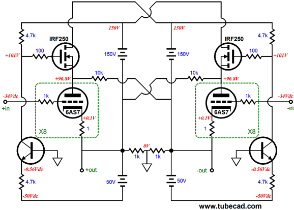 The two 6DJ8 triodes are configured as grounded-cathode amplifiers (the real ones, not the misnomer cathode-coupled amplifier). But rather than actually ground the grids, they are attached to the outputs. A short, fast negative-feedback loop, in other words. If the grid signal fails to match the input signal at the cathodes, the triode reacts in a countervailing fashion, which brings the 6AS7 output tube in line. Although it looks like the 6DJ8 cathodes will present a very low input impedance, they don't. As the 10k cathode resistors move in sync with the output swings, and as cathodes follow the output swings, the actual input impedance is much higher than you would assume. Gee, John, this is sure a nice circuit, but to be honest all those solid-state devices creeps me out. Understood. I feel your apprehension. We cannot lose the power MOSFETs, but we can lose the two transistors, as an NPN transistor can be replaced by a triode.