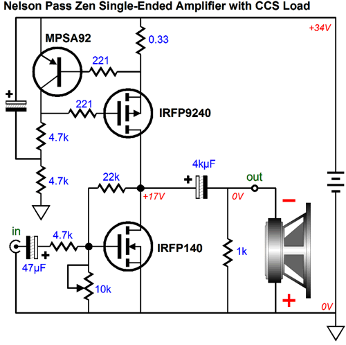 The IRFP9240 is a P-channel power MOSFET, which is configured as a constant-current source in the Zen amplifier. The PNP transistor, the MPSA92, monitors the voltage drop across the 0.33-ohm source resistor. If this voltage exceeds its base-to-emitter voltage, it conducts more current, which forces the IRFP9240's gate more positive, thereby reducing the MOSFET's current conduction and the voltage drop across the resistor. If voltage drop across the resistor falls short of the transistor's base-to-emitter voltage, the transistor conducts less current, which forces the IRFP9240's gate to become more negative relative to its source, forcing the MOSFET's current conduction up along with the voltage drop across the resistor. The 4.7k input resistor and 22k feedback resistors set the voltage gain for the Zen amplifier. The 10k potentiometer sets the centering of the output stage at half the B+ voltage. The input and output coupling capacitors seal off the DC voltage within the Zen amplifier. The loudspeaker is shown in an inverted attachment to the amplifier's output, with is negative terminal attaching to the amplifier's output, which undoes the amplifier's phase inversion at its output. That is the Zen amplifier in a nutshell. And as Vladimir Nabokov so nicely put it in his novel, Laughter in the Dark, "...although there is plenty of space on a gravestone to contain, bound in moss, the abridged version of a man's life, detail is always welcome." For example, the electrolytic capacitor that couples the B+ to the junction of the two 4.7k resistors works to improve the PSRR of the constant-current source (CCS). And we could go on and on, but let's move on to a radical variation on the Zen, as shown below.