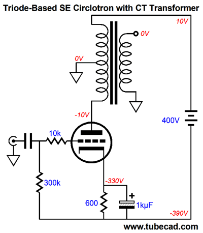 This, too, is a Circlotron; it is not a grounded-cathode amplifier; its gain across the primary will equal a little less than 2. Note how the ground attaches at the center tap and its power supply is floating. Also note how the cathode sits at -330V. Or, how about a para-feed arrangement, wherein the primary is in parallel with the triode? Is that possible? Sure.