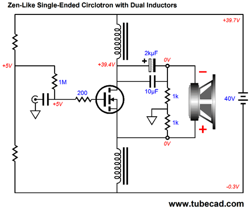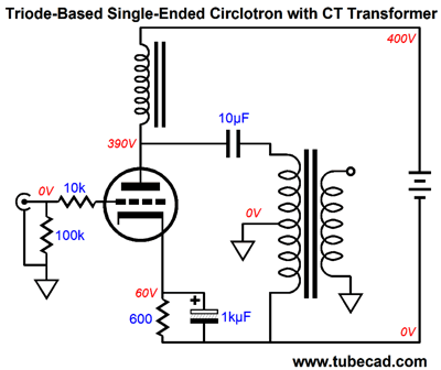 Note how this Circlotron's output impedance is twice that of the push-pull variety, i.e. Zo = rp/(µ + 1), which makes sense, as the push-pull version effectively double the transconductance over the class-A overlap region. The following circuit is a Circlotron, although only few would recognize it as being so. The key feature is that the ground was placed mid load. Mind you, the external load will be attached to the transformer secondary, but the reflected impedance is halved at the center tap on the primary, thus making a midpoint ground attachment to the load; thereby making the the Circlotron label correctly apply to the circuit.