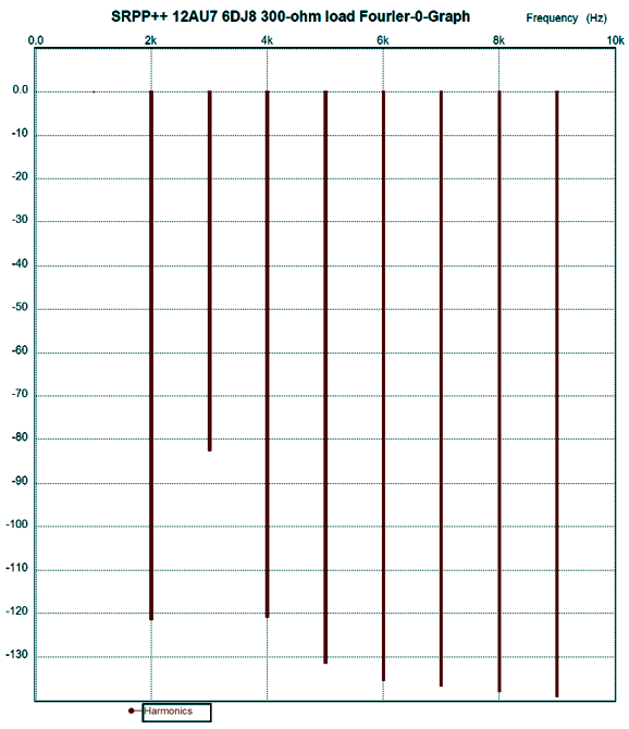 A sampling of power-supply noise is injected at the bottom 6DJ8 triode's cathode, not its grid, as you might expect. The reason behind this arrangement is that the ripple comes out inverted at the output, so non-inverting power-supply noise is needed to counter the inverted ripple. The 665-ohm resistor injects the desired amount of ripple into the cathode. With this "Aikido" technique in place, the PSRR figure improves by about 36dB, bringing the figure up to -54dB of PSRR. The SPICE simulations of this circuit are particularly fine, as the following Fourier graph shows for 1Vpk @ 1kHz into 300 ohms. Note that -80dB equals 0.01% distortion. Of course, reality is not likely to match SPICE. Why not? SPICE tube models assume a perfectly constant triode mu; reality differs. Still, SPICE does give a good predictive advantage, as an audio circuit that performs poorly in SPICE simulations is not going to perform better in reality. Why does SPICE give overly optimist results so often? SPICE assumes that all resistor, capacitor, and inductor values are 0.00000000001% on the mark and that none of these devices display any imperfections, such as a capacitor presenting any inductance or resistance, which real capacitors do. In reality, even a length of straight wire presents both inductance and resistance.