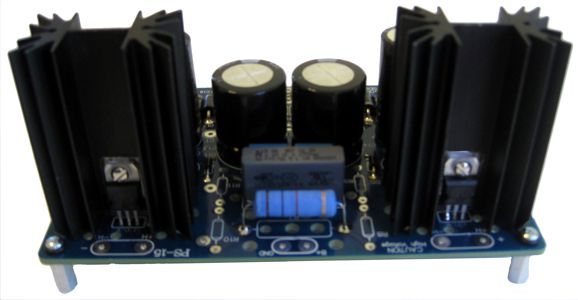 Do you see the diamond? The BC560 is a low-noise PNP transistor and the 2N3053 is a surprisingly fine NPN transistor, while the TIP50 is a high-voltage power transistor that comes in the TO-220 package. The 2N3053 and TIP50 are in cascode. Effectively, the 2N3053 is in charge and its variation in current conduction sets output voltage and scrubs away the noise. As you can guess, I could come up with an easy dozen more hybrid phono or line stages or regulated power supplies. But the big problem I faced was getting a simple and convenient power supply that could power such designs, which is why I created the PS-15. Since the two low-voltage regulator circuits on the PS-15 are independent, we can configure them as a low-voltage bipolar power supply.