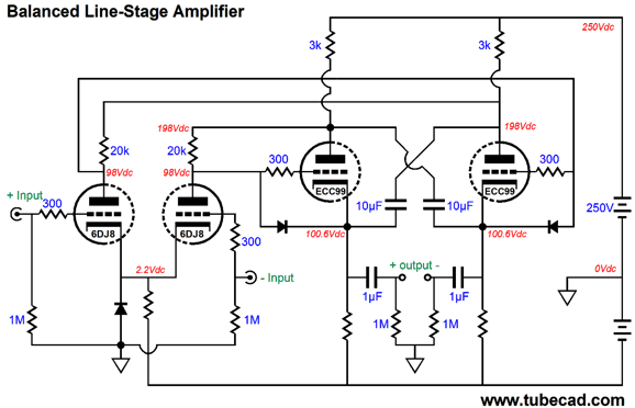 If lower impedance headphone are to be driven, an output transformer can be used; or, we could use several ECC99 tubes in parallel or different output tubes altogether, such as the 6AS7. Wait a minute, John, have you forgotten how much I hate headphones? No, indeed, no. For you I have the following balanced-output line-stage amplifier based on the same idea.