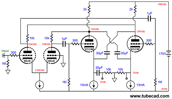 The differential input stage plate resistors terminate into the differential outputs, thereby creating two global negative feedback loops. To see how they work just image a battery being momentarily being shorted across the two outputs, which would cause one output to go positive, while the other goes negative. These two anti-phase pulses would then be relayed to the input stage and then passed on to the output triodes grids, provoking a counter reaction. Negative feedback in a nutshell. With an ECC99 output tube, an output impedance of about 80 ohms results. Now let's flesh out the topology and configure it to drive a 300-ohm load, such as the headphones made by Beyer and Sennheiser, such as the DT990 and HD800.