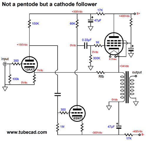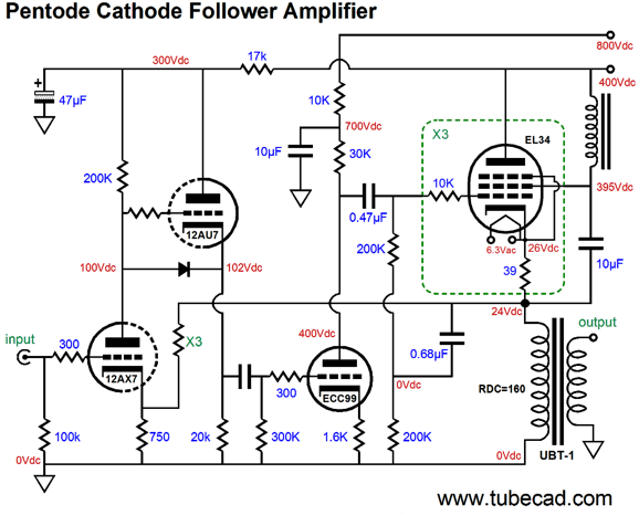 Note how the ECC99 driver triode sees 400V at its plate and works under a B+ voltage of 700V. This extra high B+ allows the ECC99 to drive the three EL34 output tubes to full output. The 12DW7 input tube holds two triodes, one a 12AX7 type and the other a 12AU7 type. We use the 12AX7 triode as the input tube and the 12AU7 as a cathode follower. Why? The ECC99-based driver stage will develop a good amount of Miller-effect capacitance, which the 12AX7's meager 1mA of idle current cannot cope with, but which the 5mA of idle current from the 12AU7 can. A feedback loop returns the signal at the output transformer primary to the 12AX7 cathode. Not a lot of negative feedback can be applied, say only 6dB worth. In fact, I would not use the feedback loop, as the cathode-follower output stage already produces a clean output. One key point is that the EL34 output tube is being used as a triode, not a pentode. Indeed, we are getting our cake and eating it too. Because the EL34 grid number-2 sees a filtered DC voltage, the EL34 behaves as if the plate also saw a filtered B+ voltage. If we want to make a true pentode cathode-follower output stage, we must attach the capacitor not to ground, but to the primary.