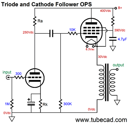 Here we see a input stage driving a cathode-follower output stage. The input stage would have to deliver plus and minus voltage swings of 300V to get full output from the cathode follower. But as the input stage's plate sits at 250V, it can only swing positively up by 150 volts before it hits the B+ voltage; and it can only swing down about the same 150 volts before its grid goes positive relative to its cathode. In other words, we only get one fourth of the potential power out of the cathode-follower output stage. One workaround is to use a bipolar power supply, which allows the driver stage to swing huge output voltages.