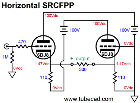 No solid-state constant-current sources and no coupling capacitors; and if the triodes are well matched, no differential DC offset. (The safer approach would be to use one coupling capacitor.) By the way, I know that hundreds of thousands (if not millions) of audiophiles long to build a Nelson Pass Zen single-ended power amplifier. Well, the following push-pull SRSFPP power buffer offers some advantages over the famous Zen.