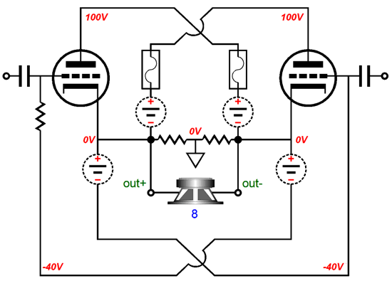 Another approach would be to use an autoformer, as it would not only protect the speaker, but it would also yield higher output power and far lower distortion and output impedance from the output tubes. How would an autoformer protect the speaker? Remember that it is only a long length of solid-core wire wrapped around a ferric core. Its DCR (direct-current resistance) is low, very low, say 0.4 ohms. Its inductance presents a higher impedance at frequencies above 20Hz; but at DC, the the impedance equals the DCR. Should one floating power supply's fuse blow, the speaker will only see a DC offset voltage of about 10mV. Perfectly safe. Even if an output tube melts down and becomes a dead short, the world is not lost, as the fuse and the low-DCR will save the day. Most of the current will flow through the 0.4-ohm autoformer wire instead of the speaker's 8-ohm impedance before the fuse blows. The speaker will still experience one huge jolt, before the DC state establishes itself, so you might still blow a driver or two in your speaker. An output transformer would be a bit safer, as no DC offset could occur on its secondary. Don't forget that an output transformer will also transfer brief current surges, just no steady current flow. What about brief tube arcs and autoformers? Use fuses on the floating power supplies. An output transformer's biggest advantage is that high-quality output transformers are made and their relatively high winding ratios allow us to use far more linear output tubes than the 6AS7. (Just because it looks something like a 2A3 does not mean it is as linear.)