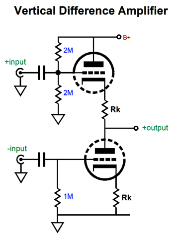 The vertical differential amplifier works by presenting the top and bottom grid with a pair of input signals equal in amplitude, but inverted in phase relative to the other. This arrangement results in one triode drawing greater current and the other less current, which results in the nexus, the connection, between top and bottom triodes to move either up or down with the balanced input signal. Ideally, such an arrangement would yield a signal gain of 2 (+6dB), as the absolute amplitudes of both balanced signals would sum. With real tubes, however, we get slightly less than a gain of 2 (about 1:1.7 or +4.6dB with most tubes).