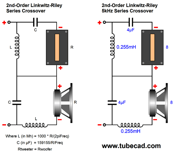 Is this a problem? In general, no, at least not with most solid-state power amplifiers. It can be a problem with a tube-based power amplifier without a negative feedback loop, which somewhat straddles both voltage-out and current out amplifier types, with triode-based being closer to voltage-out; pentodes, current-out. And it certainly will prove to be a huge problem for current-output power amplifier, no matter the output devices used. Why? The current-output power amplifier puts out a set amount of current, while the voltage-output power amplifier puts out a set amount of voltage. So, if the current-output amplifier encounters twice the impedance, it will put out the same amount of current, which means that it will also put out twice the voltage. The result will be a +6dB boost at the crossover frequency. Of course, if you are using active electronic filters and bi-amping, then both amplifiers will see 8-ohms. (Just another reason why bi-amping makes so much sense.) I have never seen the Linkwitz-Riley crossover alignment applied to the series crossover topology, so I had to roll my own. It wasn't hard.