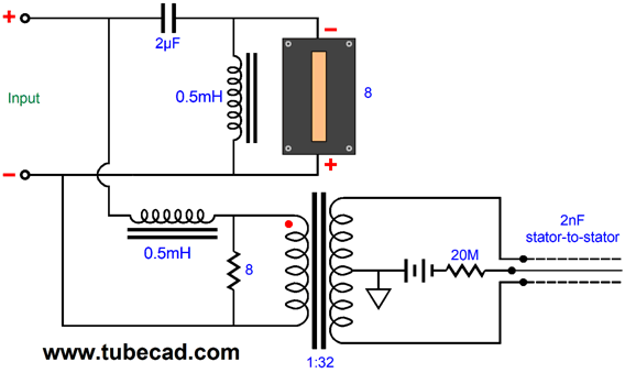 The electrostatic speaker becomes magnified by a thousand fold by the step-up transformer, so the 8-ohm resistor is shunted by 3.24µF of capacitance.