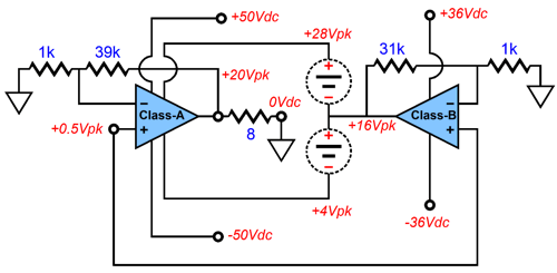Notice that the bottom half of the class-A amplifier's output stage sees it current flow lessen to 2.5A, while the top half sees its rise to 3.5A. The delta, the difference, , i.e. 1A, between these two is what the speaker sees; and the top half of the class-B amplifier's output stage sees it current flow rise by at least 1A. This amount of current against the 28V voltage drop across the top half of the class-B amplifier's output stage produces 28W of heat dissipation. In other words, although the top half of the class-B amplifier's idle current is low, it must be robust enough to sustain big current swings. Also note that the input and driver stages run off the +/-36V rails. This is essential, as the input signal is referenced to ground, so the input stage's negative power-supply rail must never go positive. Here is an example wherein the entire class-A amplifier sees only the floating power-supply rail voltages: