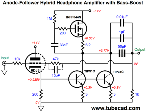 The big question is: Why would we need a hybrid anode follower circuit? One possible use would be in a headphone amplifier. Dynamic headphones require heavy current swing, but not big voltage swings—just the opposite of what tube do well, i.e. deliver big voltage swings, but weak current swings. The problem we face with all the previous hybrid anode-follower circuits is that the solid-state device sees the sam voltage drop as does the triode, which means a lot of heat. The workaround is to use two B+ voltage, one high-voltage B+ for the triode and one low-voltage B+ for the solid-state devices.