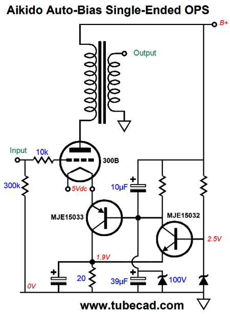 The NPN TIP50 high-voltage transistor monitors the voltage drop across the 20-ohm current-sense resistor. If the voltage drop is too low, the TIP50 will increase its current conduction and the PNP MJE15033 transistor's base and emitter voltage will fall as a result, causing the 300B to draw more current, as its grid will effectively become more positive relative to its cathode. Conversely, if the 300B is drawing too much current, the voltage drop across the 20-ohm resistor will be too high, causing the NPN TIP50 to conduct less, which in turn will force the 300B's cathode voltage higher, thereby reducing its current flow. In other words, auto-bias. In actual use, we need a few more parts, as shown below.