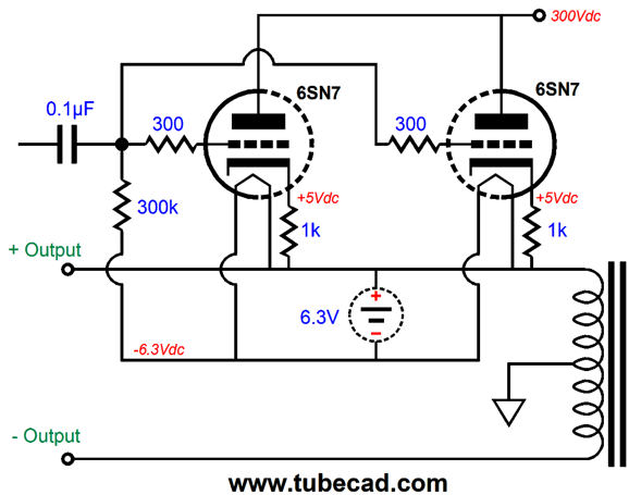 We must employ an input coupling capacitor on the output stage. Note that a floating power supply powers the heater element and that this power supply attaches directly to the non-inverting output. In addition, the 6.3Vdc power-supply voltage partially biases the 6SN7 triodes, the other portion of bias voltage coming from the 1k cathode resistors. Each channel must get its own independent and floating heater power supply. By the way, we can get clever with batteries to make floating grid-bias power supplies.