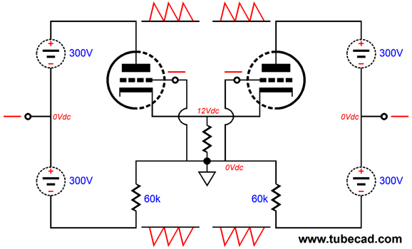 This is the basic topology. The triode's grids are at ground potential (i.e. 0Vdc) and share a cathode resistor that terminates into ground. A balanced set of input signals drive the triodes in anti-phase.