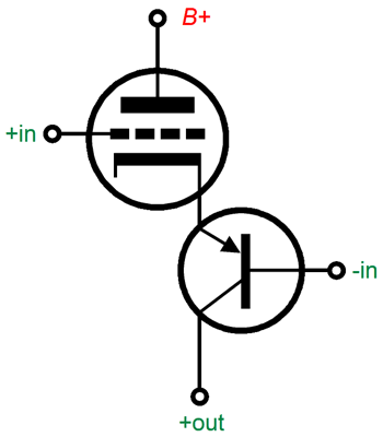 The best approach is not to fixate on one circuit, but to abstract the triode and the PNP transistor as a two-device unit, which we insert in other more complicated circuits. In an alternate universe, some tubes come pre-built with each triode getting its own PNP transistor built in a metal base that doubles as a heatsink. In our universe, we have to wed them together ourselves. This hybrid combo allows us to dream up circuits that would have dazzled your father or grandfather. For example, the simplest use of the triode-PNP combo would be as a replacement for a cathode resistor to cathode-bias the triode. Effectively, the PNP transistor functions as a capacitor-multiplier circuit.