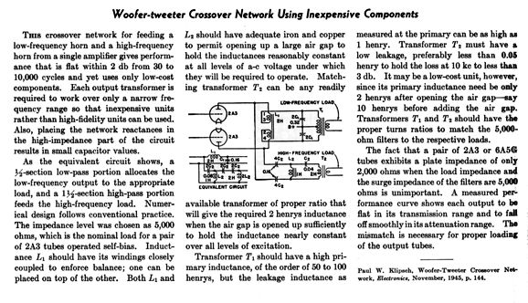 This is a push-pull output stage that uses two output transformers, one for the woofer and one for the tweeter. Note the common-mode choke, L1, which does not require an air-gap. Also note that the B+ voltage only attaches to the low-frequency transformer. The woofer gets a 2nd-order crossover slope, while the tweeter gets a 4th-order slope. My first thought was, could an air-core transformer be used for the tweeter? I have seen large air-core toroidal transformers that were wound on a wax form that was later melted away. Here is the full snippet of information.