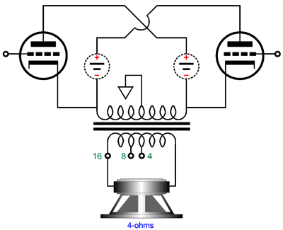 The 800-ohm primary will now see 240V peak voltage swings and 300mA peak current swings and the 4-ohm loudspeaker will dissipate 36W. Here is the math: In order for the 16-ohm secondary tap to deliver the same output wattage into a 16-ohm load as it does with an 8-ohm load attached to the 8-ohm tap, the 16-ohm tap must deliver 1.414 times more voltage swing that the 8-ohm tap. Thus, the 16-ohm tap must present a lower winding ratio than the 8-ohm tap. How much less? The inverse of 1.414, which is 0.707. We multiply 0.707 against the 8-ohm tap's 20;1 ratio and we get 14.14:1 as the 16-ohm tap's winding ratio. Next, we divide the primary's 240V peak voltage swing by 14.14 and get 16.97V peak voltage swing from the 16-ohm tap, which equals 36W into a 4-ohm load. Isn't math great? Okay, there's another workaround to the problem of excessive primary impedance, but only if the output transformer offers a split primary, such as the output transformer used in the Heathkit WM-6 and in some Audio research amplifiers.