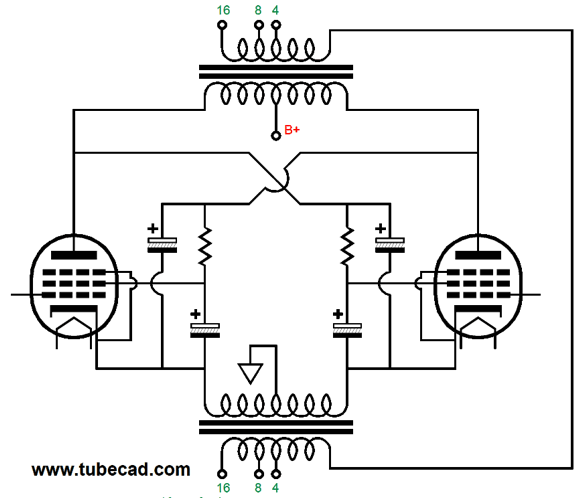 Note the phasing of the output transformers. Note that the two secondaries effectively work in anti-phase to each other. Note that the 8-ohm loudspeaker attaches to both 8-ohm output taps, which effectively loads each secondary by 4-ohm, not 8-ohms. The winding ratio remains unaltered, so the 4-ohm load is reflected to the primary as 1600 ohms (we are using the 3.2k output transformer of the previous examples). Due to the AC short presented by the large-valued capacitors, the two primaries are effectively in parallel in AC terms with both output tubes, so each primary sees half the peak current flow that the full-on output tube experiences. For example, at full output, the left output tube will draw 300mA, which will divide evenly between each primary, so each primary will undergo a peak voltage swing of 240V. At the same time the 20:1 winding ratio will deliver 12Vpk at each secondary, which combine to 24Vpk, as that is what the loudspeaker sees across its terminals. Let's do the math: 24Vpk across 8-ohms results in 36W od dissipation, as 24²/(2x8) = 36. Well, we have the desired output voltage, but do we have the needed output current? Yes. The transformer's current ratio is the inverse of its winding ratio, or 1:20 in this example. The tube pulled 300mA and each primary got half, so 150mA times 20 equals 3A; 3A peak AC into 8 ohms equals 36W, as 3² x 8/2 equals 36. We passed the math test. Note that while the two primaries were effectively in parallel, the two secondaries are in series with each other. If we own 4-ohm loudspeakers, we attach the speaker across the two 4-ohm output taps; 16-ohm loudspeaker, the two 16-ohm output taps. If the output transformers are rated for 20W, their combined output power is 40W.